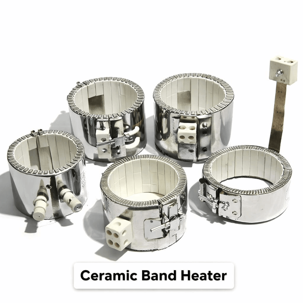 Ceramic heaters are ideal for engineering polymers such as polycarbonate, nylon, ABS, and PPS, where stable heating through the middle barrel section is essential to prevent material degradation.