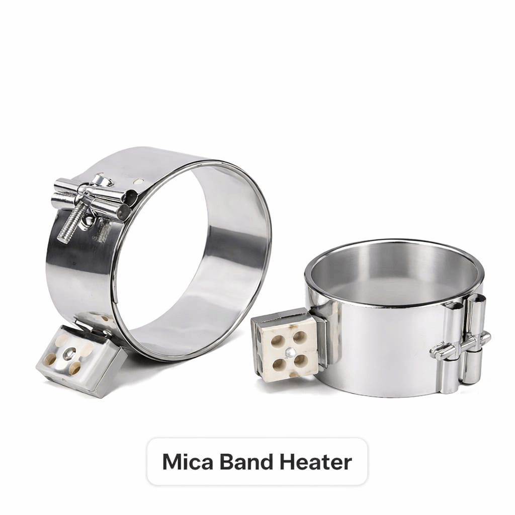 Our mica band heaters are widely used in small injection molding setups because of their compact design and efficient heat transfer. Built using nickel-chromium resistance wire, high-grade mica insulation, and a stainless steel outer cover, these heaters are ideal for temperatures up to 350°C.